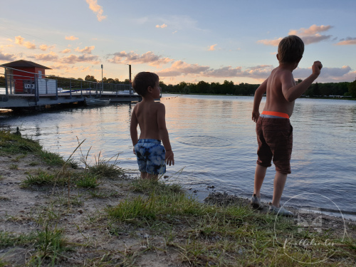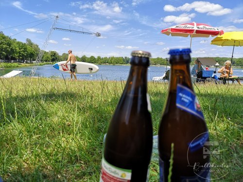 Außerdem ist, was Wassersport betrifft, noch einiges mehr geboten. Es gibt eine Tauchschule, einen SUP-Verleih und eine WAKEBOARDANLAGE. Da von uns niemand Wakeboard oder Wasserski fährt, haben wir uns damit begnügt, zuzugucken. Die Kinder kamen aus dem Staunen gar nicht mehr heraus, wenn die Könner ihre Tricks auf den Rampen vorführten. Irgendwann entdeckten sie auch die Anfänger, die sich einer nach dem anderen auf dem Wasser lang machten, noch eine Weile mitgeschleift wurden, umständlich an Land schwammen, um ihr Glück noch einmal zu versuchen. Ein Heidenspaß! Wer möchte kann sich dazu noch leckere Schwimmbadpommes und kalte Getränke aus dem Wirtschäftle direkt neben der Wakeboardanlage holen.