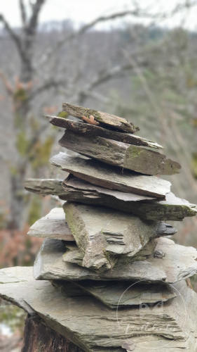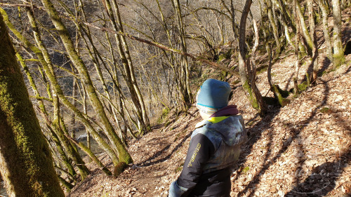 Hinter der nächsten Kurve wartet schon der Abzweig zur Felsenweg-Variante. Hier verlassen wir die Traumschleife, um den Abstieg zur Layekaul anzutreten. Der Weg ist schmal, steinig und steil und sollte nur von trittsicheren Wanderern begangen werden. Unser 5-Jähriger hat den Weg mit gelegentlichem Gehen an der Hand geschafft. Wem der Weg dann doch zu abenteuerlich ist und die abgekürzte oder ganze Traumschleife gehen möchte, der folgt ab hier der Markierung der Traumschleife. Ein geeigneter Treffpunkt mit den Begehern der Felsenpfad-Variante ist die Aussichtsplattform (siehe Karte). Von dem Punkt, wo die Felsenpfad-Variante wieder auf die Traumschleife trifft, muss man dann allerdings ein kurzes Stück auf der Traumschleife (300-400 Meter) zurückwandern.