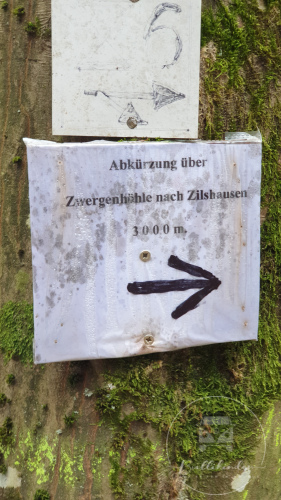 Nächste wichtige Wegmarke ist die „Verbindung Abzweig Nord“. Hier hat man die Möglichkeit, die Wanderung auf insgesamt ca. 5 Kilometer abzukürzen (siehe Markierung im Kartenabschnitt). Auf diesem Weg geht es in ca. 3 Kilometern sanften Anstieg über die Zwergenhöhle, einer schönen Felsrippe mit Mini-Höhle, zurück nach Zilshausen.